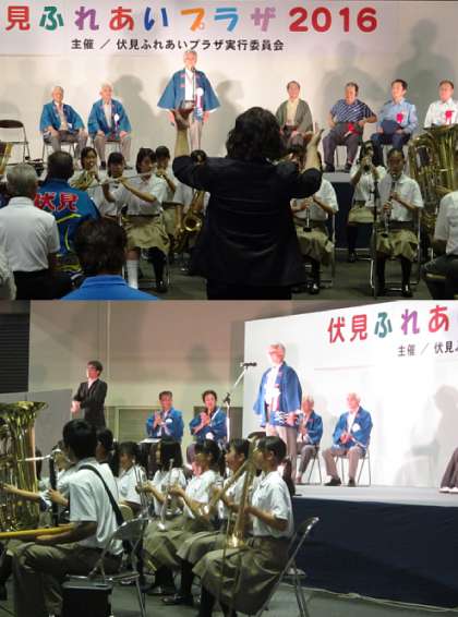 本日(9月4日)、京都府総合見本市会館 京都パルスプラザにて行われました「伏見ふれあいプラザ2016」に吹奏楽部が参加しました。開会宣言に合わせて吹奏楽部のファンファーレにてオープニングが始まりました。実行委員長や市長のあいさつ、来賓紹介後、ふれあいステージが始まり、「お酒ソングコレクション〜酔奏楽の為の〜」を演奏しました。