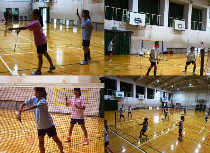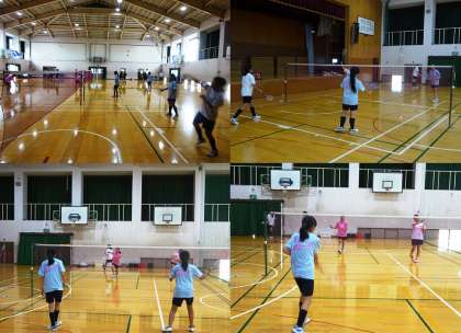 バドミントン部は、11名で活動しています。練習で身につけた技術が試合で使えるように、ゲーム練習を中心に取り組んでいます。まずは、10月に行われる秋季大会(新人戦)団体戦ベスト4を目指して頑張っています。応援よろしくお願いします。