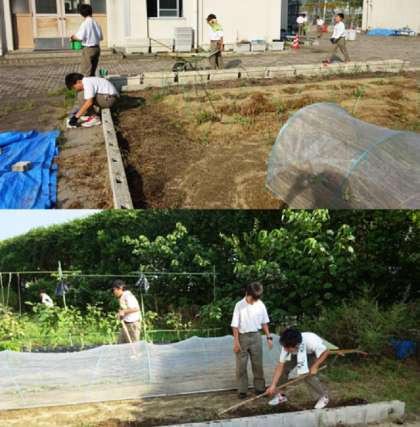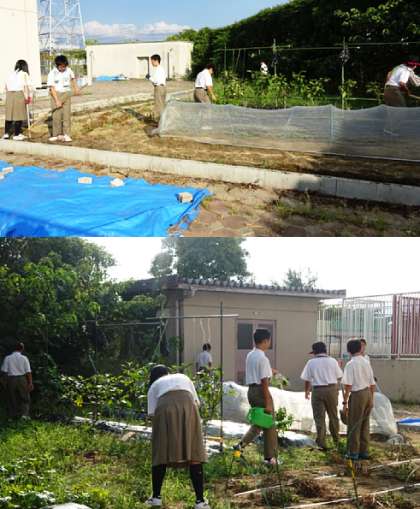 農園芸部は男子12名、女子4名の合計16名で活動しています。現在は、春夏野菜の収穫を終え、秋冬野菜に移行しました。今畑では、秋ナス、バジル、青梗菜(チンゲンサイ)、サツマイモなどが収穫をむかえようとしています。また、大根、ジャガイモ、小カブ、レタスなどの種まきを完了しました。残念ながら果樹は不作に終わりました。とのコメントでした。また、時間のあるときには校内の草抜きをしてくれています。
