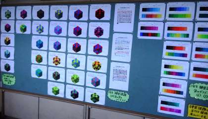 新しい掲示物です。1年生の廊下では合唱コンクールの様子、美術室の前には生徒の作品が掲示されていました。