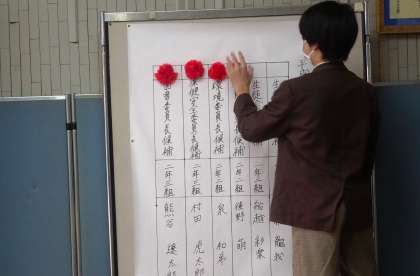 今朝、選挙管理委員長が立候補者の前で報告をしていました。これからの一年間、よろしくお願いします。