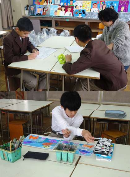 3限の授業の様子です。上から、2年2組 社会、2年3組 国語、英語(分割授業)、1組 美術 です。