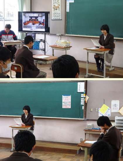 1限の授業の様子です。朝から頑張っています。2組 社会の授業では、法廷の学習で裁判の模擬授業を真剣に行っていました。