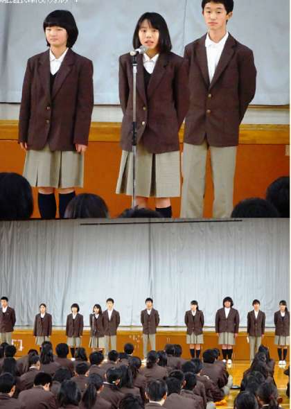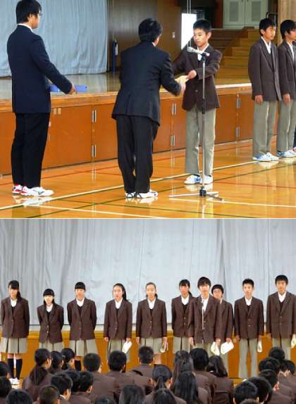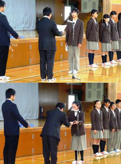 本日の6限、平成28年度後期認証式を行いました。旧生徒会長のあいさつに始まり、新生徒会本部、後期代表専門委員へ認証書が渡されました。これまでの生徒会活動を受け継ぎ、より活発な生徒会にしていってください。新本部役員のみなさんは1年間、代表専門委員のみなさんは半年間、自らのこと以外にいろいろなことに取り組んでいかないといけませんが頑張ってください。役員や委員でない人は協力をしてあげてください。よろしくお願いします。