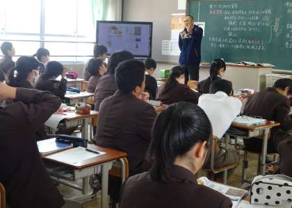 2限の授業の様子です。上から、2年2組 美術、2年3組 社会、1組 音楽 です。