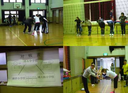 本日、横大路小、納所小、洛水中のPTAが集まっての三校親善スポーツ大会が横大路小学校の体育館で行われ、ソフトバレーボールを行いました。