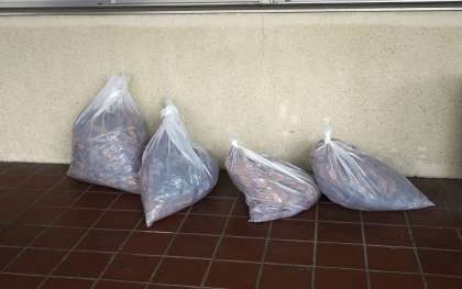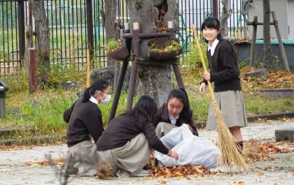 お昼休みに吹奏楽部の子どもたちが、落ち葉の掃除をしてくれています。たまった落ち葉は農園芸部で作っている農園にまかれます。毎日ありがとう。