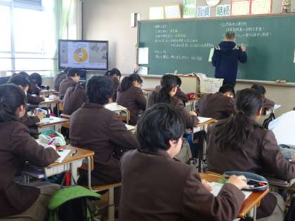3限の授業の様子です。上から、2年2組 社会、2年3組 国語、英語(分割授業) 、1組 です。