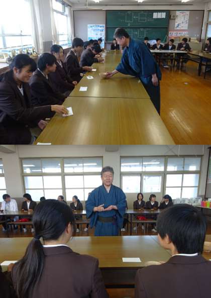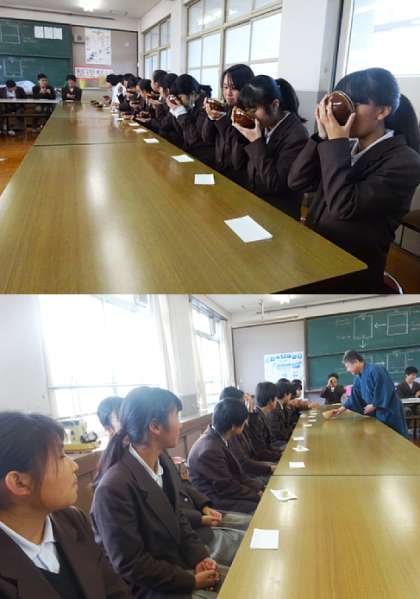 本日の6限、伝統文化体験を通して日本の文化を見つめ直す機会として、3名の講師の先生に来ていただき、茶道教室を行いました。教室では歴史の話をしていただきました。