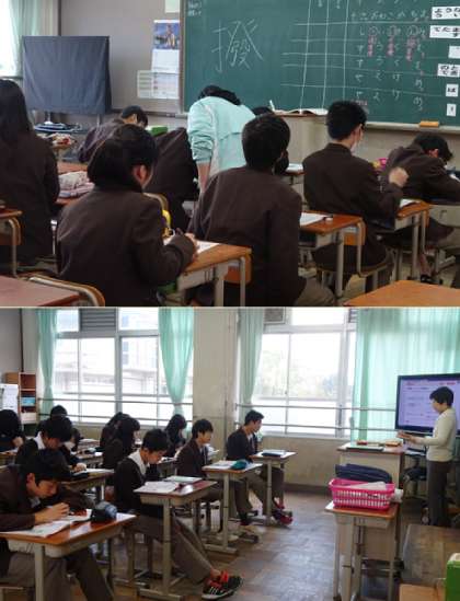 1限の授業の様子です。朝からがんばっています。上から、2年2組 技術、2年3組 国語、英語(分割授業)、1組 です。