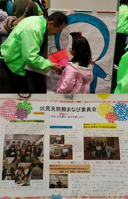 伏見支部では、子どもたちが楽しめるゲームコーナーのお手伝い(ボランティア)をしました。また、校区の小学校の子どもたちもステージ発表でがんばりました。