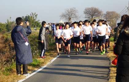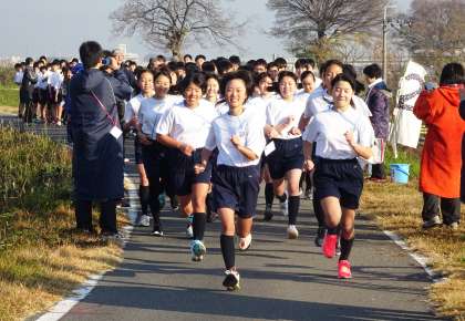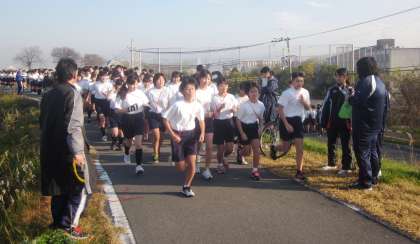 本日、マラソン大会が予定通り実施されました。桂川左岸堤防のサイクリング道路を学校付近から納所・八幡方面に走り、かわきた自然運動公園を折り返して学校付近を通り過ぎ羽束師橋付近で折り返して学校付近まで戻ってくる約11kmのコースを走ります。9時の3年女子を1番目にスタートし、後のグループは3分間隔でスタートしました。