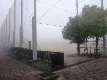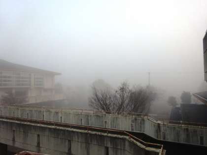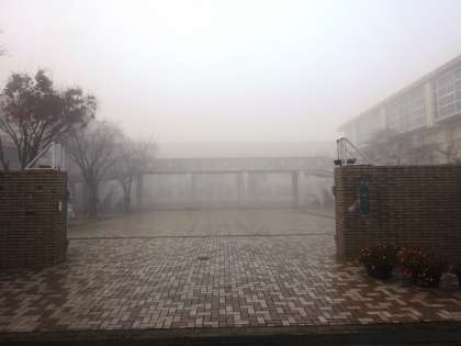おはようございます。学校周辺は濃い霧におおわれています。視界がよくありません。登校時には交通安全等、十分注意するように声かけをお願いします。