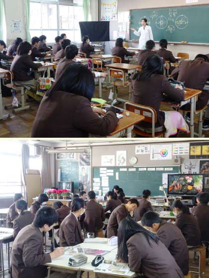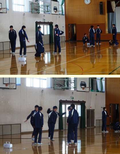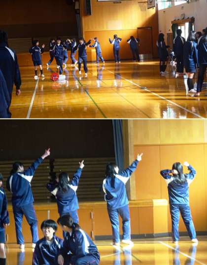 3限の授業の様子です。上から、2組、3組 体育(創作ダンスをグループごとに考えています)、4組 理科、5組 美術 です。