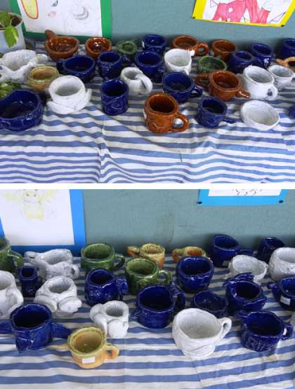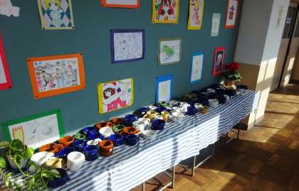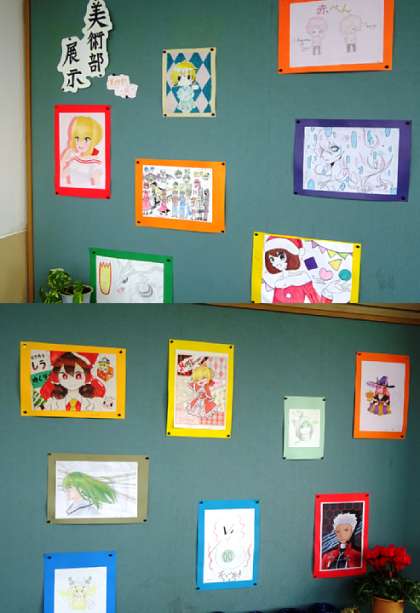 美術室の前には、美術の生徒作品と美術部の作品が展示されています。