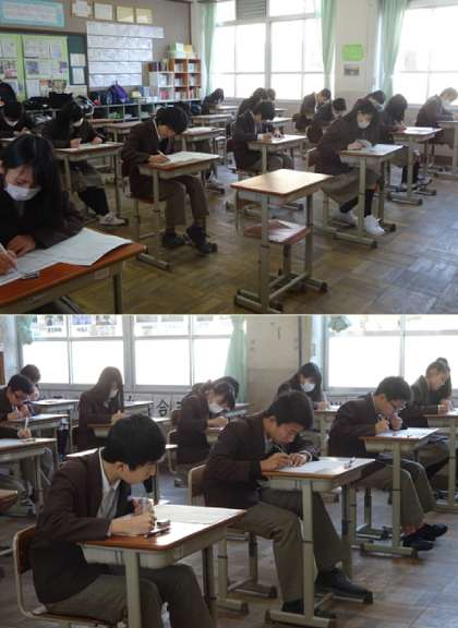 本日より、3年生は第5回の総括テストが実施されます。1日目は英語、国語、音楽のテストが行われます。全ての教科でリスニングテストが実施されました。限のテストの様子です。上から、2組、3組、4組、5組 です。