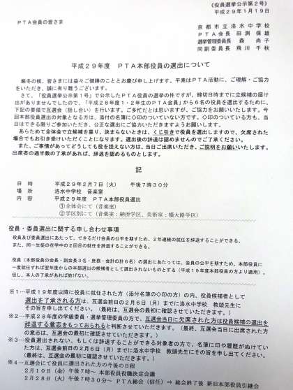 明日(2月7日)、19時30分より平成29年度のPTA本部役員の互選会が行われます。お忙しいとは思いますが、出席の程 よろしくお願いします。