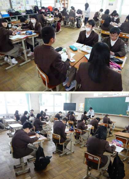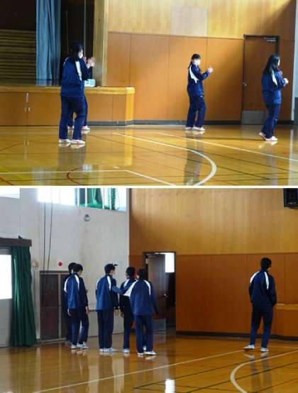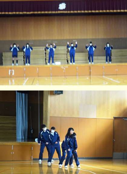 3限の授業の様子です。上から、2組 家庭科、3組 数学、4組、5組 体育(創作ダンスを考えています)です。