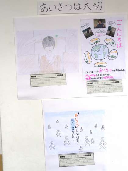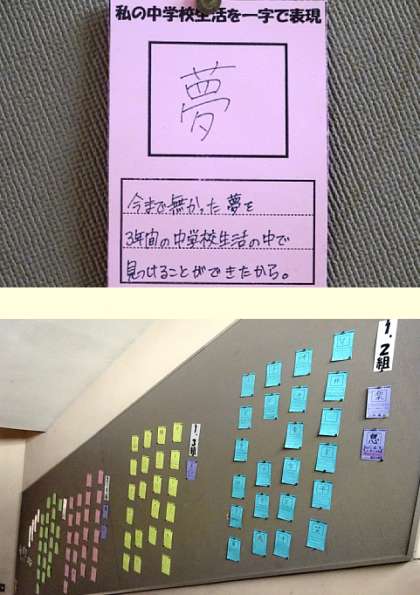 3年生の国語科での作品(ポスター)と3年間の思い出を1字で表したものです。