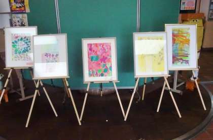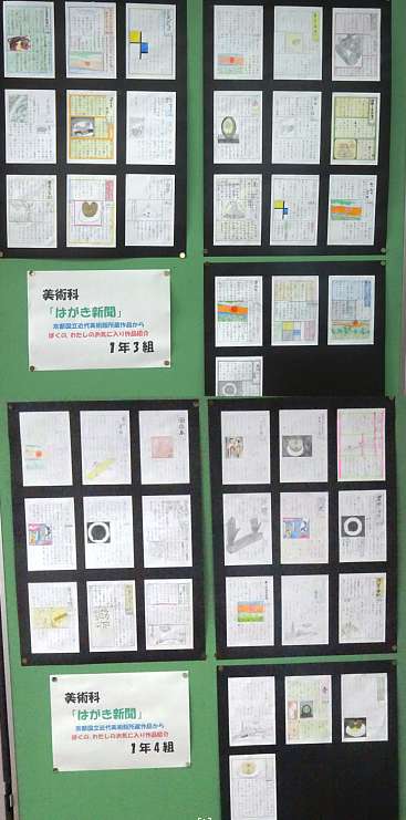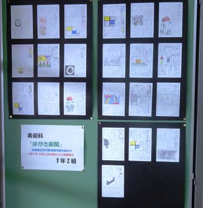 玄関に新しく、作品が展示されました。写真は、1組の作品(花の絵)、1年生の作品(はがき)です。