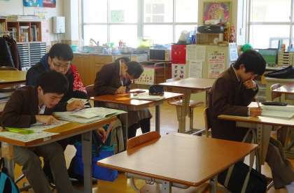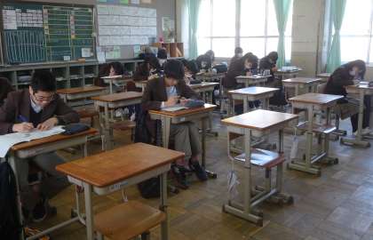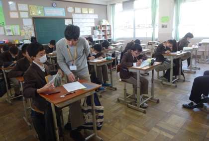 2限の授業の様子です。3年生は本日、公立前期選抜学力検査のない生徒が登校しそれぞれの課題に取り組んでいました。また、1組は社会の授業でした。