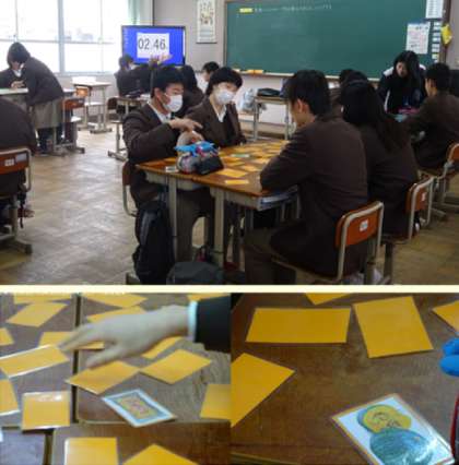 3限の授業の様子です。上から、2組 家庭科(食品群をカードを使って学習しています)、3組 数学 です。
