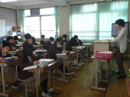 1限の授業の様子です。3組は 国語、英語の分割授業です。2組では、支援員の方に「なぜ、夢を持つのか」と題して話をしていただきました。みんな真剣に話を聞いていました。