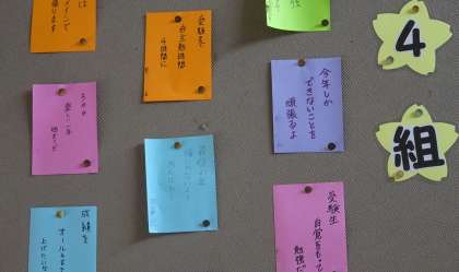 階段の掲示板にひとりずつの「3年生になっての決意」が掲示されていました。受験のこと、部活動のこと様々でしたが、みんなの想いが書かれていました。想いが達成できるように頑張って下さい。