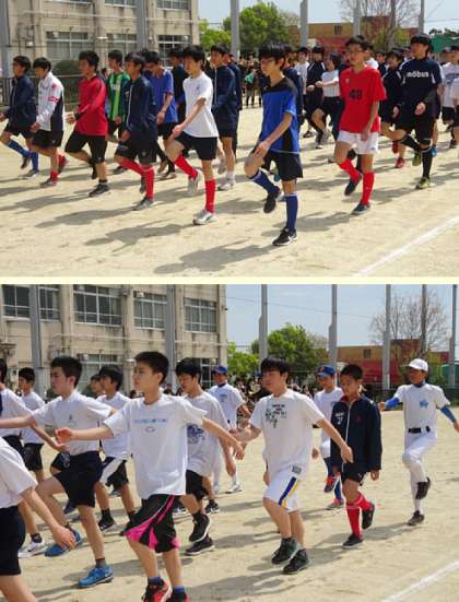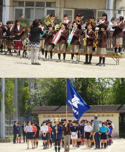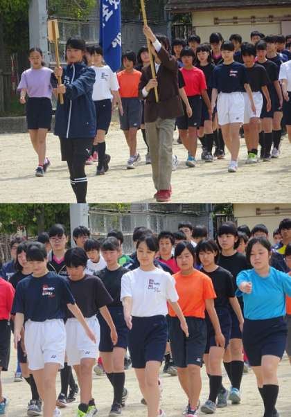 明日の春季大会開会式に向けて、行進練習をしました。行進練習には吹奏楽部も参加してくれました。きちんと行進できていました。