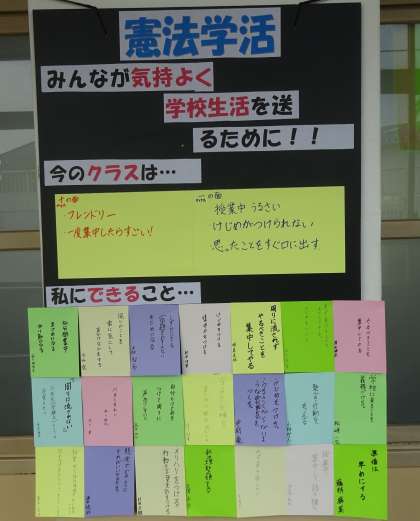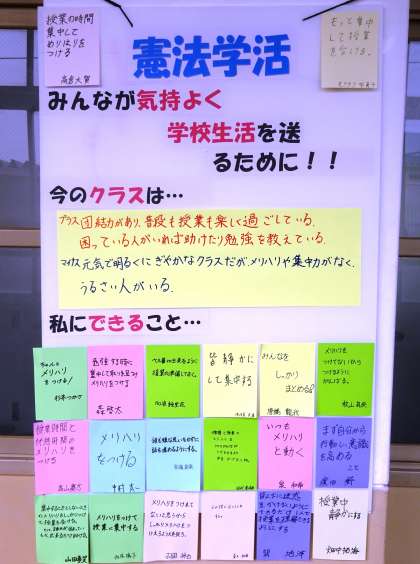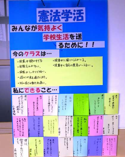 3年生の廊下には、憲法学習でのクラスの想いが掲示されていました。