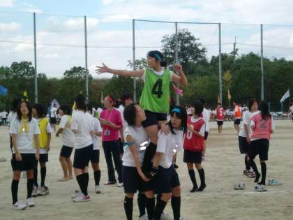 4人組で騎馬を作り、トラック半周でバトンタッチ。各クラス9チーム作り、4周半で競いました。