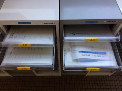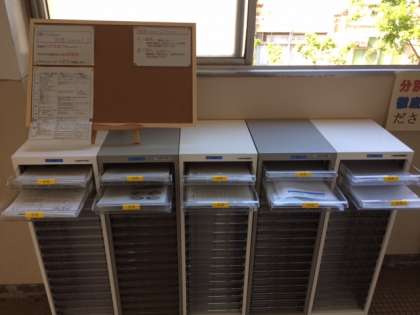 5教科毎に1台の引き出し付き棚を置き、月別に復習出来るプリントを入れてもらっています。先ほど3年生のコーナーを見に行くと、4月5月の英語の引き出しは、すべてのプリントがなくなっていました。定期テスト前ということもありすごい需要です!