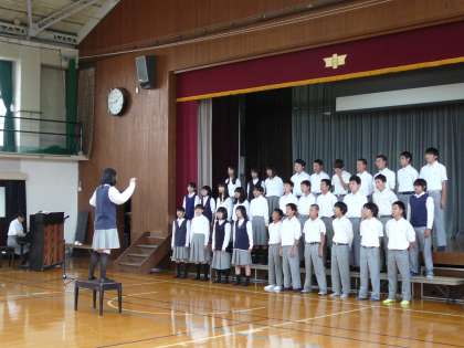 最初に入退場の練習を全クラスが確認した後、実際に通して合唱もしました。