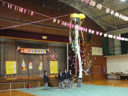最後は、くす玉割り! 吹奏楽部I君のドラムロールの後、見事くす玉が割れました!!(実は本番前に一度勝手に割れていましたが、大急ぎで修復完了!)