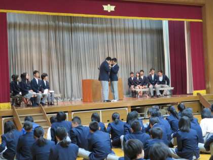 最後は旧生徒会長から新生徒会長に「生徒会長バッジ」の引き継ぎです。毎年全校生徒の前で行いますが、見ているだけで身が引き締まる思いがします。