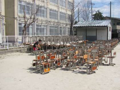 そして午前中の活動が終わったほとんどの部の生徒が、使用しなくなった机椅子約200セットを、西校舎4階からグラウンド東側までせっせと運んでくれました。