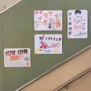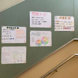 1年生の階段に来週から始まる部活動のポスターが掲示されています。