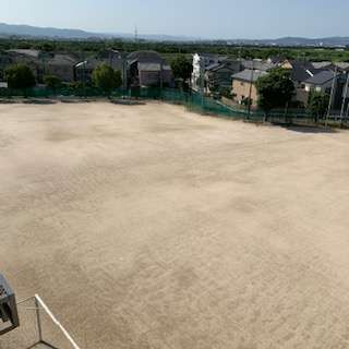 もう一枚の写真は西校舎4階からのグラウンドの風景です。夕暮れ時はとてもきれいな夕焼けが見られます。癒やされるスポットです。