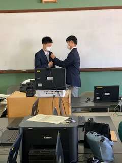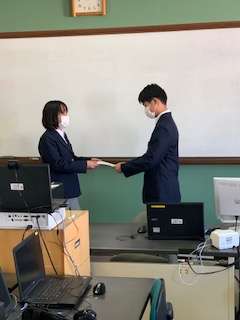 本日は生徒会新旧本部役員がそろい、旧役員への感謝状贈呈と新本部役員への認証状渡し、生徒会長のバッジ受け渡しをしました。おなじみとなったZoomで行いました。