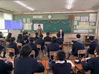 また生徒からの「一日にはどのくらいのお客さんが来ますか?」という問いに「店内の座席のレイアウト」を黒板に書いて説明しながら、お客さんの回転率や営業時間内での人の流れを計算しながら日々経営しておられる話もしていただきました。生徒のみんなには夢を持つことの大切さなども熱く語っていただきました。