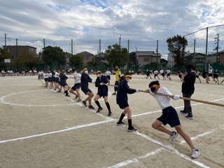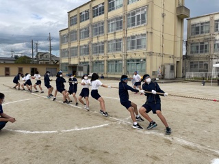 2年生綱引きが行なわれました。腰を落としどのクラスもすばらしいチームワークでした。