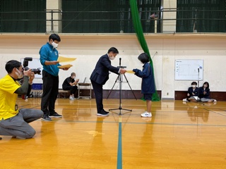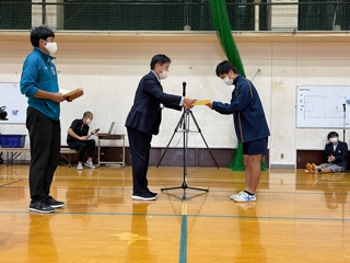 各種目、総合での優勝クラスの表彰、校長の話、体育委員長からの「おわりの言葉」がありました。
