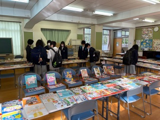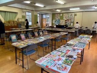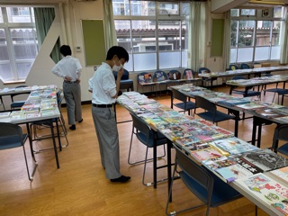 各学年ごとに時間差をもうけて、入口ではしっかりと消毒した上で、会議室いっぱいの本を見て、各自が気に入った本に付箋をはっていきました。来年度に図書室に置くことになるので、みんな真剣に選んでくれていました。