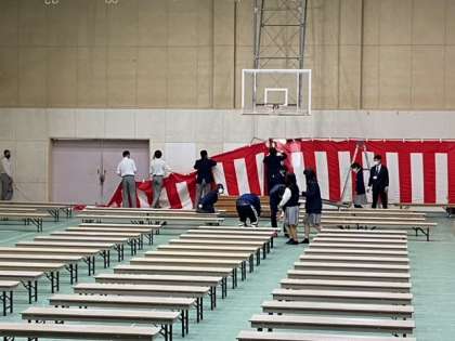 旧学級役員のみんなで、入学式の設営を行いました。新2年生・新3年生ともに、効率よく準備してくれ、予定時間より早めに完成しました。