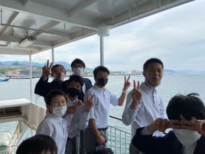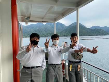 予定より早いフェリーに乗れました。ホテルゆっくりする時間が増えます。みんな、景色を楽しんでいます。