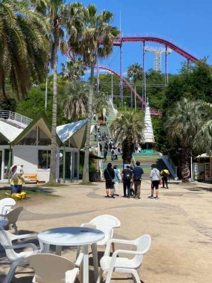 最後の目的地に着きました。山間にある遊園地です。見える階段、これが3つあるほど高低差の大きい遊園地です。