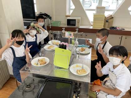 昼食後のデザートに最高の5時間目の調理実習は1年4組です。みんなやる気満々で昼休みから実習がスタートしました。おいしく出来上がり、みんな最高の笑顔でいただきました。