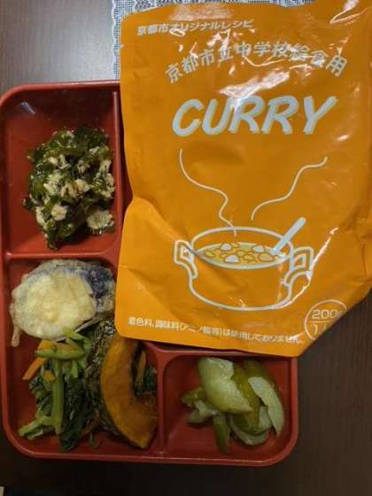 それでは、今日のメニュー紹介です。人気上位のカレーでした。今日の注目は、「なすの天ぷら」と「素揚げかぼちゃ」です。この2つの食材は京都産の野菜で、京都の給食には京都産地のものという、何という乙なメニューでしょうか!しかも、その味が絶品。カレーとの相性も抜群で、箸休めに「きゅうりのナムル」も最高。カレーは、数種類ある温かいメニューの1つなのですが、実はこの温かいメニュー。冬になると多くなるのですよ。細かいところまで考えている給食。