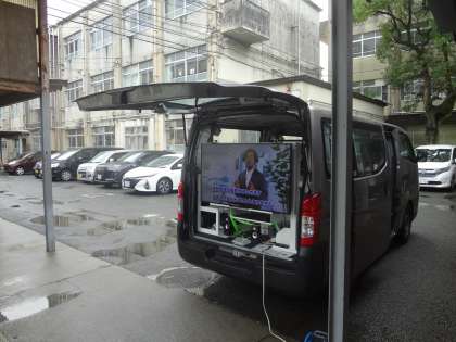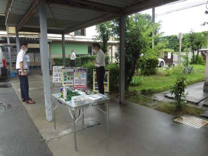 実際の模型や、映像を使いながらの啓発活動でした。あいにくの豪雨で、多くの皆さんにご覧になれなかったことが残念でしたが、三者懇談で来校された保護者の方や生徒に、啓発ビラの配布やポケットティッシュの配布など、京都府内で増加傾向にある大麻使用の撲滅に向けた呼びかけを行いました。報道の可能性もありましたが、豪雨のため取材は行われませんでした。