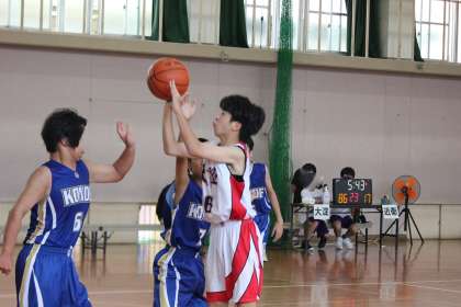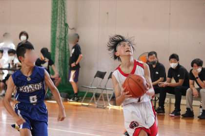 第1P、開始から大淀中のペースです。キャプテンFくんの華麗なステップからのシュートや、Fくん(2−3)のオフェンスリバウンドからのシュートなど、開始2分で10−0とリードします。